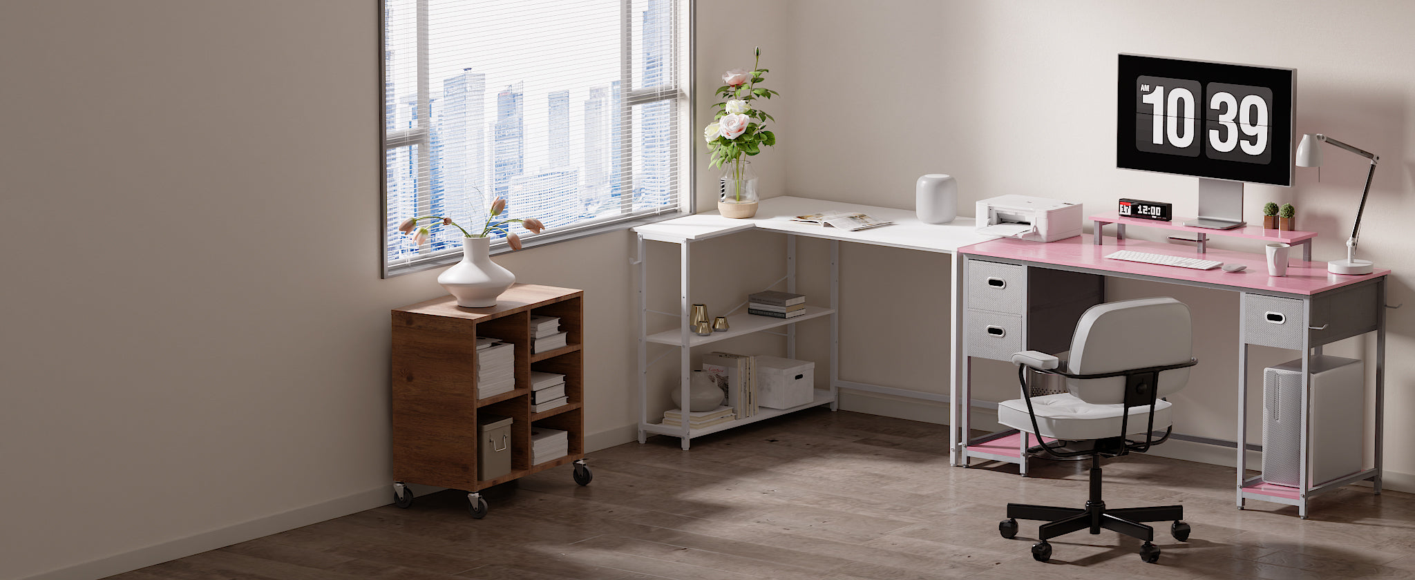 The L-shaped design enlarges the desktop space that provides spacious workstation for printers and other items, meeting your needs for home office, writing, studying, gaming, etc.
